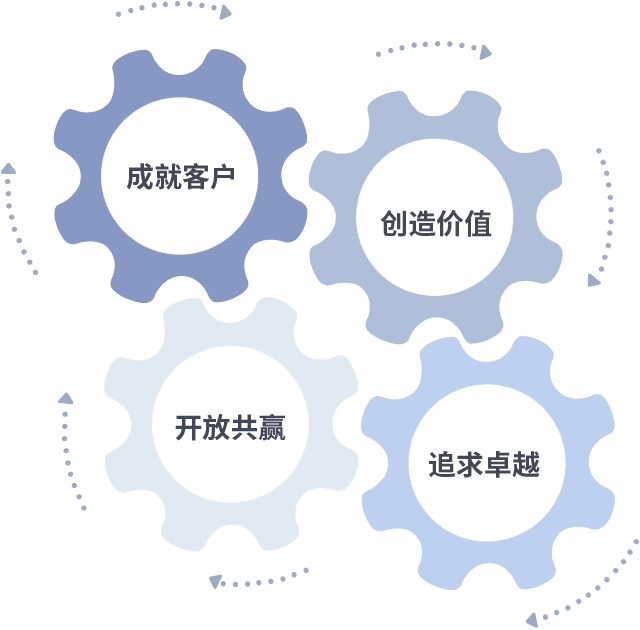 成就客户是一切决策的出发点,,创造价值是衡量所有工作的标准,,,,追求卓越是我们做事做人的态度,,,,开放共赢是我们的格局也是最终的结果。。价值观的齿轮环环相扣,,,推动着组织里的每个人不断向前。。
